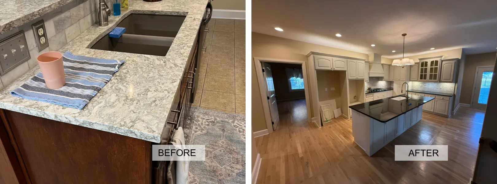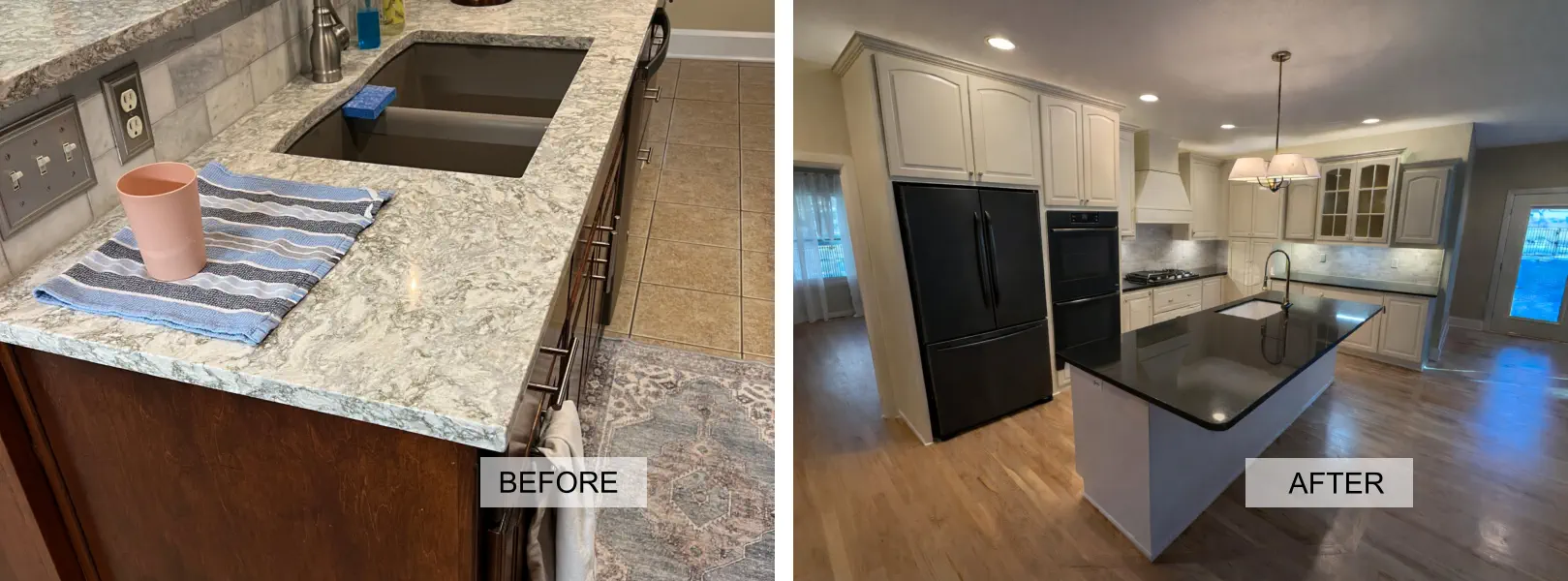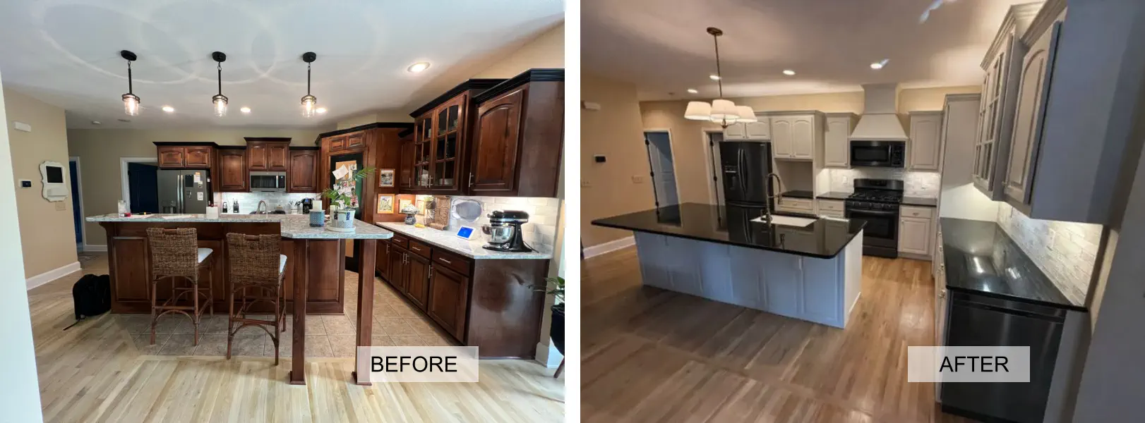 A recent kitchen remodel transformed a once-dark, heavy space into a bright and modern showpiece. The outdated dark cabinets were replaced with light, airy tones that instantly opened up the room. Sleek hardware, clean-lined fixtures, and fresh contemporary finishes completed the update, giving the kitchen a crisp, inviting, and elevated look that feels both current and timeless.