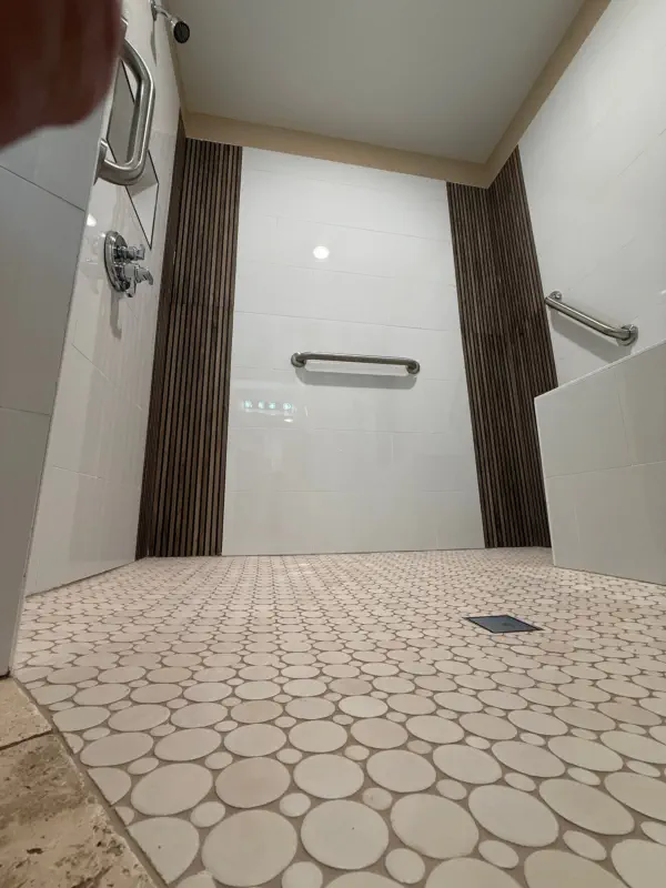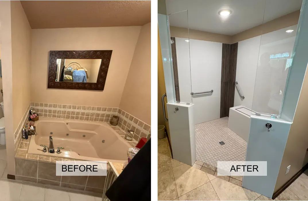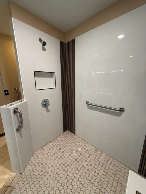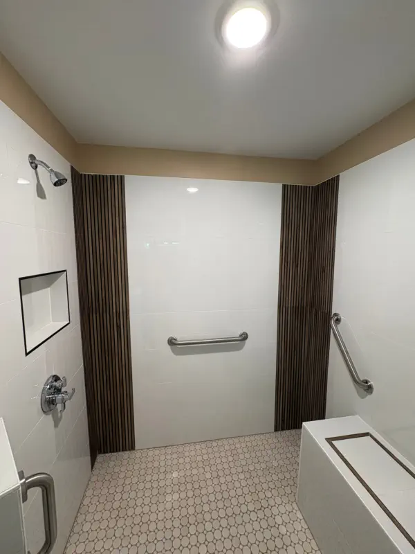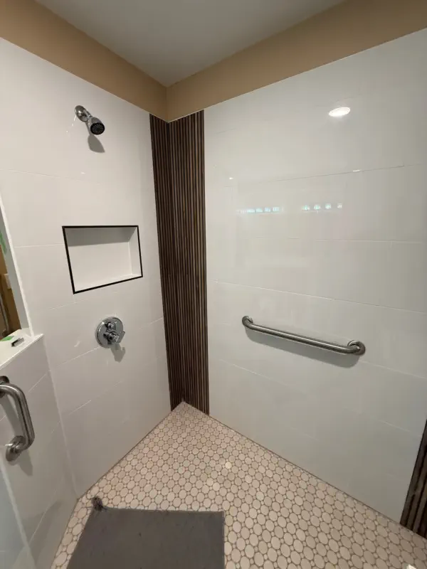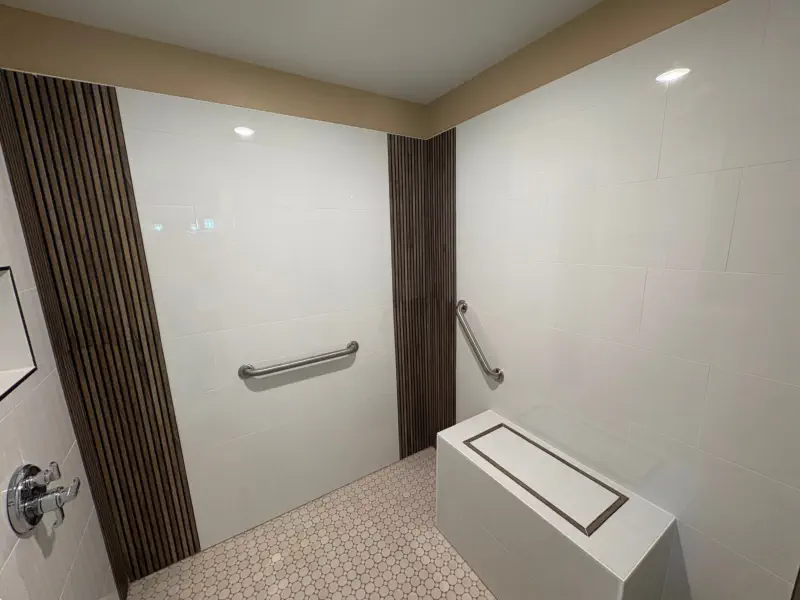 The remodel includes building a custom walk-in shower with a flush-entry base, updated lighting, new tile throughout, and upgraded plumbing fixtures. Accessibility features like grab bars and added storage solutions are also incorporated, giving you a bathroom that not only looks better, but works better for everyday use and long-term living.