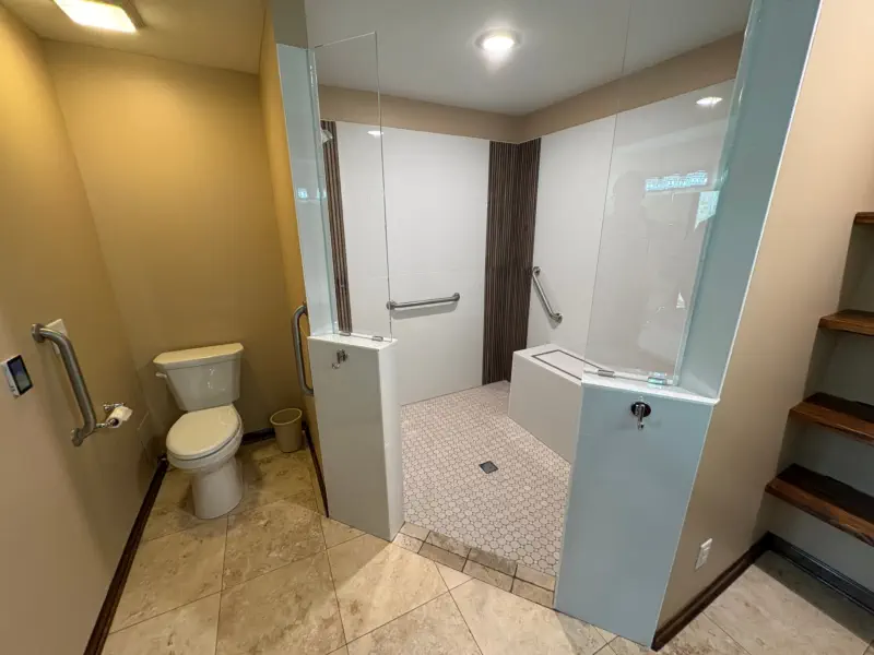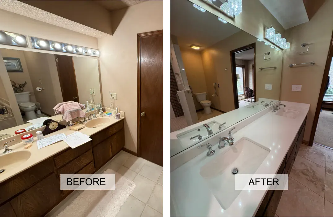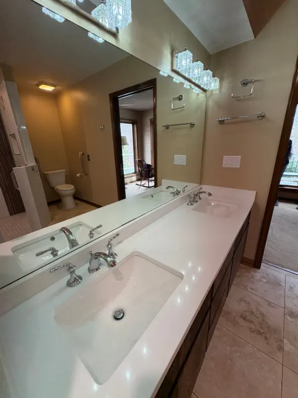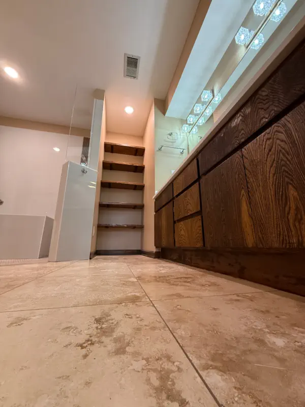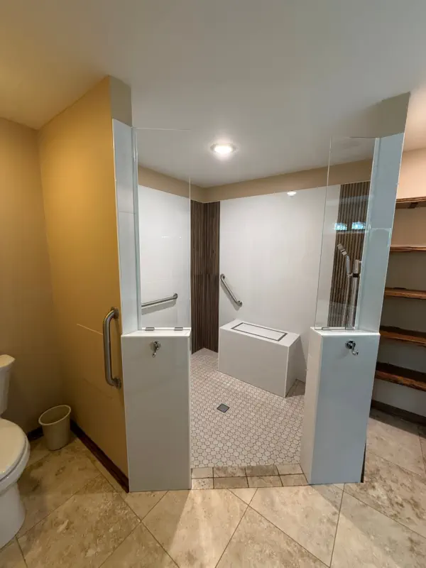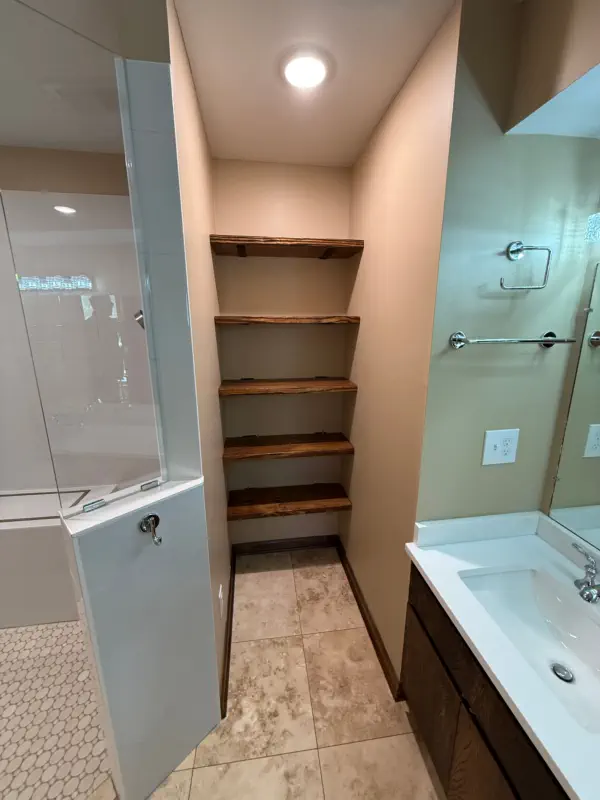 The remodel includes building a custom walk-in shower with a flush-entry base, updated lighting, new tile throughout, and upgraded plumbing fixtures. Accessibility features like grab bars and added storage solutions are also incorporated, giving you a bathroom that not only looks better, but works better for everyday use and long-term living.