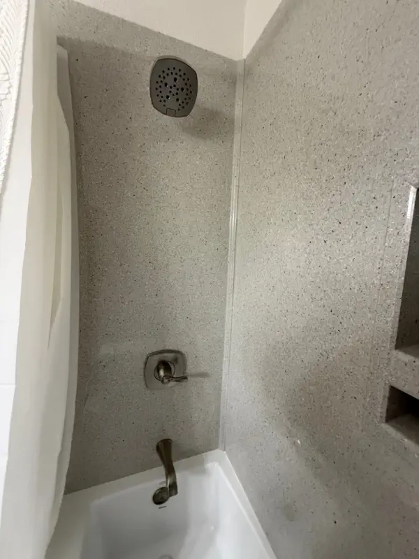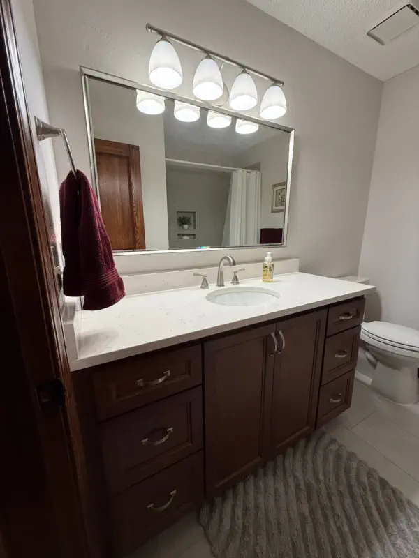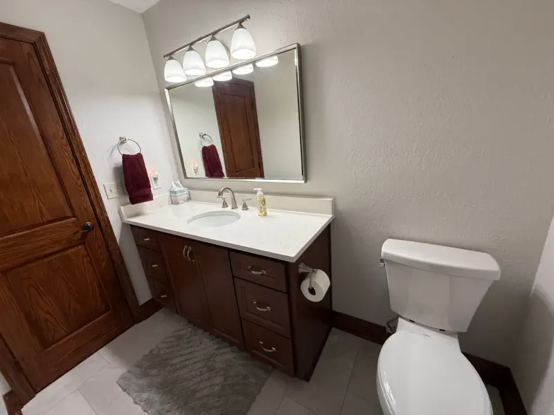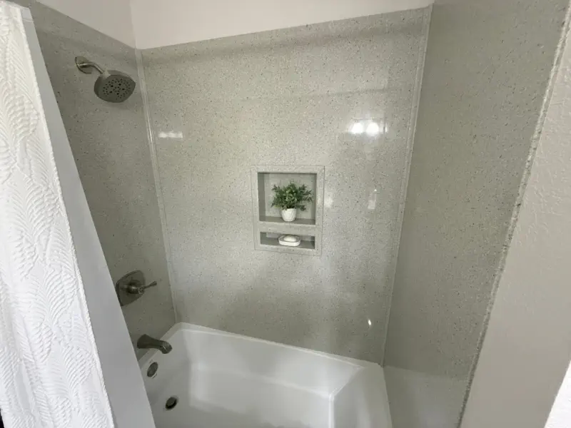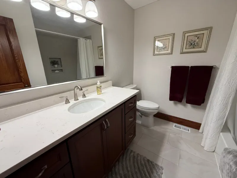 This hall bathroom remodel updates the space with a clean, modern look by removing the existing tub, vanity, fixtures, flooring, and finishes, and replacing them with a new tub and shower system with updated valve and raised showerhead, a new vanity with top and faucet, upgraded GFI outlet, new toilet, and fresh flooring and trim. The result is a refreshed, functional bathroom that is easy to maintain and designed for everyday comfort.